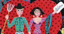 naive painting of an engaged couple,opposites attract a farmer with farm animals and a tractor and a city girl fond of nightclubs and excersise