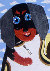 In this performance “artwork” there were 47 sausage dogs that took part and formed the delegates, speakers and interpreters of the UN Human Rights committee.  It looked so funny, the dogs were all different types of sausage dogs;  short , long and wired haired, black, brown and reddish and some were constantly barking, while others whimpered or sat quietly whilst others were bored and some could be found napping- just like the real thing really. The detail of the painting below is one of my own Sausage Dogs.( Melbourne tales to be continued)