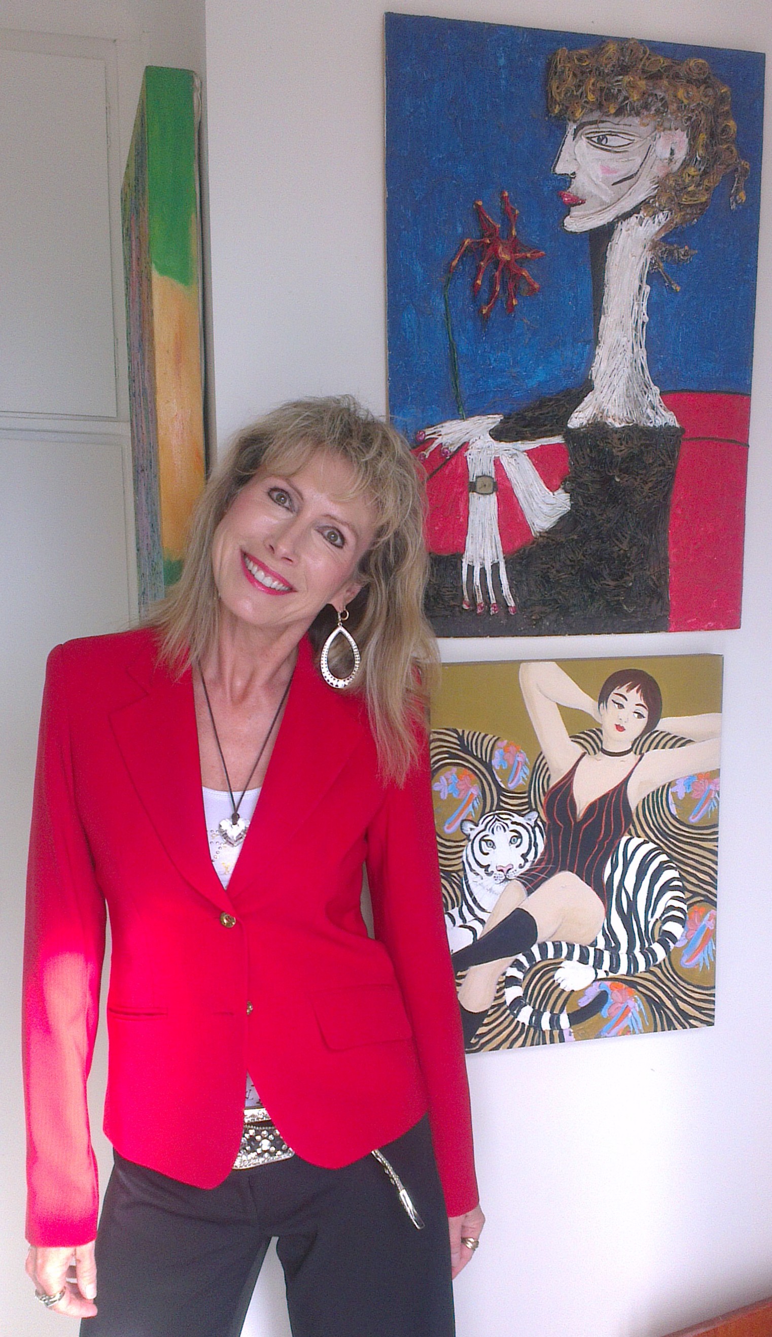 artist marie jonsson harrison dressed in red with artworks by her father ted jonsson and bronwen roodenrys on her way to carols by candlelight